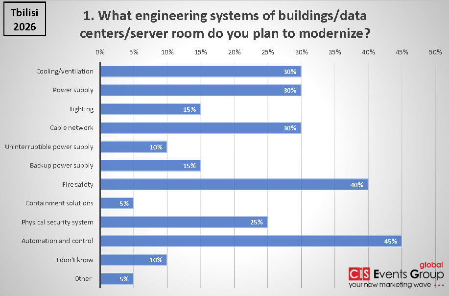 Параллельно компании активно планируют модернизацию инженерных систем. В первую очередь речь идет об автоматизации и системах управления (45%), что указывает на тренд цифровизации эксплуатации зданий и ЦОДов. Значительный интерес также проявлен к системам пожарной безопасности (40%) — фактор, напрямую связанный с управлением рисками и соответствием нормативным требованиям. Системы охлаждения, вентиляции, электропитания и кабельной инфраструктуры набрали по 30%, что свидетельствует о комплексном подходе к обновлению базовой инфраструктуры.