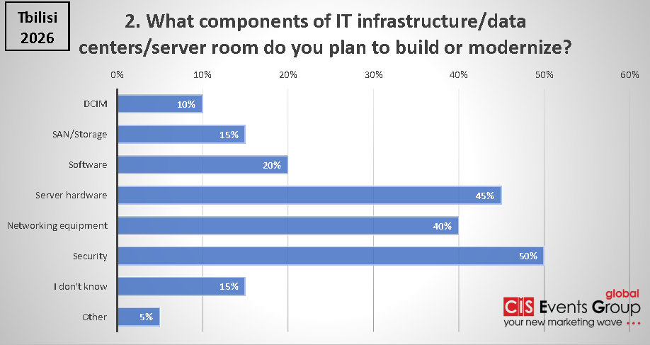 На форуме «BIT-2026. Around the Data Center. Around Cloud. Around IoT. around IP. Around Security», прошедшем 26 марта в Тбилиси, были представлены показательные данные об интересах аудитории и инвестиционных приоритетах компаний в сфере ИТ и инженерной инфраструктуры. Результаты опросов демонстрируют устойчивый фокус бизнеса на кибербезопасности, модернизации критически важных систем и развитии дата-центровой инфраструктуры.
