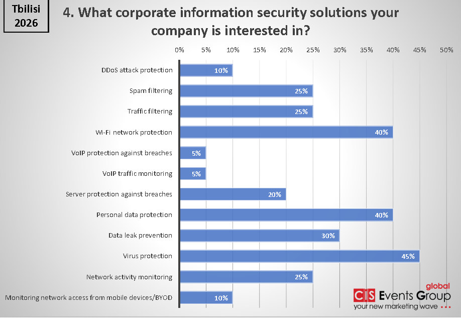 В сегменте корпоративной информационной безопасности наибольший интерес участников вызвали решения по защите от вирусов (45%). Это подтверждает сохраняющуюся актуальность базовых, но критически важных средств защиты на фоне роста числа кибератак. Практически равное внимание уделяется защите персональных данных и безопасности Wi-Fi сетей (по 40%), что отражает усиление требований к конфиденциальности и расширение периметра угроз в условиях гибридной работы и мобильных сотрудников.